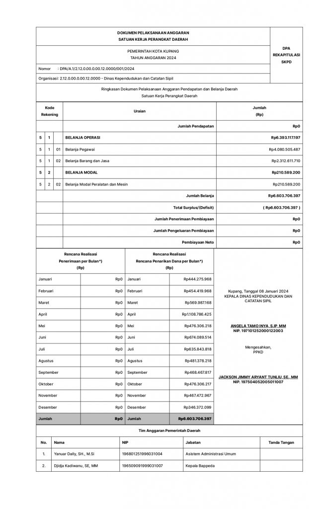 Dokumen Pelaksana Anggaran Dinas Dukcapil Kota Kupang Tahun 2024