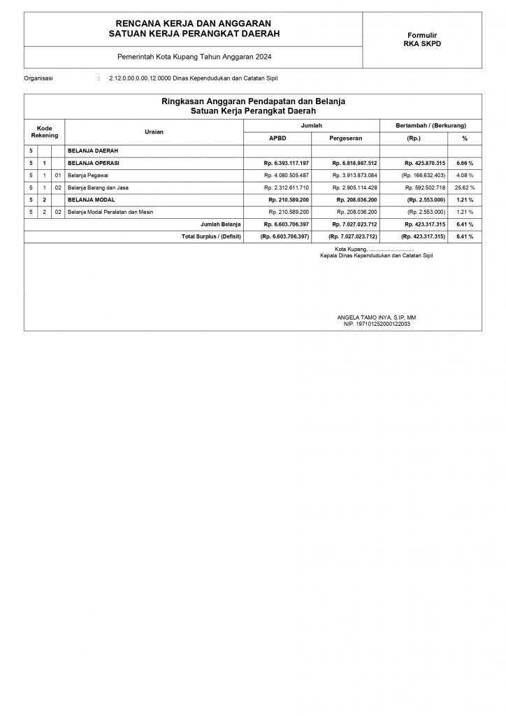 Ringkasan Anggaran Pendapatan dan Belanja Dinas Dukcapil Kota Kupang Tahun 2024