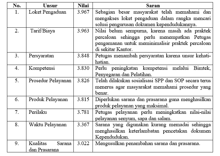 Pertanyaan berupa kuesioner dengan 4 jawaban pilihan yang menggali 9 unsur pelayanan didapat hasil Nilai terendah didapat dari unsur kualitas sarana yakni 3,022. Hal ini ditengarai karena sebagian besar peralatan yang digunakan sudah out of date atau tidak layak digunakan, sehingga kinerja pelayanan berkurang secara keseluruhan dan mengakibatkan waktu pelayanan menjadi lebih lama dan berada di urutan kedua unsur yang mendapat nilai terendah yaitu 3,367. Sedangkan nilai tertinggi didapat dari unsur loket pengaduan yg mendapat respon tertinggi yakni 3,967. Hal ini sebagai akibat dari semakin sadarnya masyarakat akan loket yang disediakan khusus untuk menangani permasalahan administrasi kependudukan yang mereka miliki. Adapun rincian responden dan nilai kepuasan masyarakat adalah sebagai berikut :