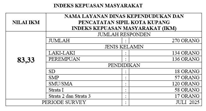Salah satu upaya dalam perbaikan pelayanan adalah survey kepuasan masyarakat sebagai pengguna layanan. Dinas Kependudukan dan Pencatatan Sipil Kota Kupang telah melakukan survey kepuasan masyarakat dengan berpedoman pada Permen PAN RB no. 14 Tahun 2017, pada bulan Juni 2024 dengan sampel 270 responden. Metode pengambilan sampel menggunakan sistim Simple Random Sampling dengan asumsi semua penduduk Kota Kupang yang berjumlah 404.120 jiwa adalah pengguna layanan Dinas Kependudukan dan Pencatatan Sipil Kota Kupang.