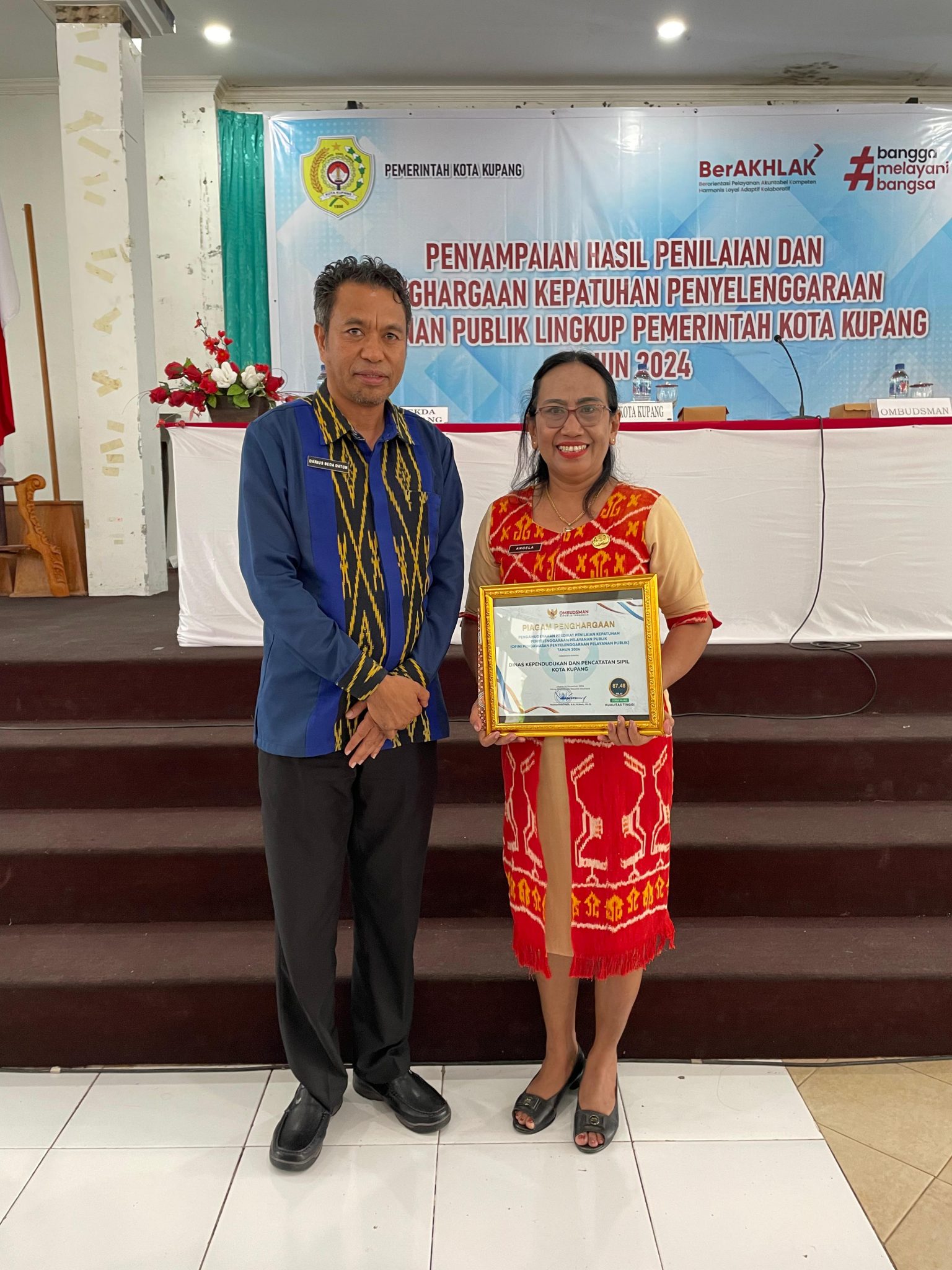 Bertempat di Aula Rumah Jabatan Walikota Kupang, Kamis 5 Desember pukul 14.00 Wita Dinas Dukcapil Kota Kupang bersama beberapa Instansi lainnya, menerima Piagam Penghargaan Nilai Kepatuhan Penyelenggaraan Pelayanan Publik dari Ombudsman RI perwakilan NTT. Hadir pada acara tersebut PJ Walikota, PLH Sekda Kota Kupang dan Ketua Ombudsman NTT, Bp. Darius Beda Daton.
